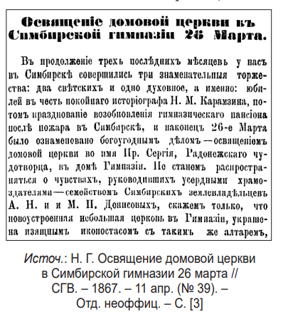 - см.: Н. Г. Освящение домовой церкви в Симбирской гимназии 26 марта // СГВ. – 1867. – 11 апр. (№ 39). –Отд. неоффиц. – С. [3–4].